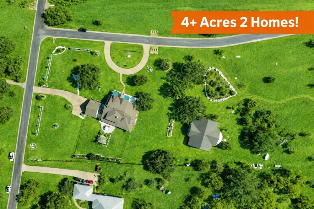 Set on 4.33 oak-studded acres in the gated community of Double Horn, this exceptional estate blends elegant Hill Country living with true multi-generational flexibility. Formerly a David Weekley model home, the 1.5-story main residence showcases timeless craftsmanship with hand-scraped bamboo flooring, rich architectural details, and inviting living spaces oriented to sweeping views of the private acreage. The chef’s kitchen features granite countertops, a large island with seating, abundant cabinetry, warming drawer, wall oven, and instant hot water, opening to a bright breakfast area and a living room anchored by a natural stone fireplace and built-ins. The main-level primary suite offers wood floors, high ceilings, porch access, and a spa-inspired bath. A study with custom built-ins, formal dining room, lower level media/game room with two additional bedrooms and bath, plus an upstairs game room, full bath, and bedroom with kitchenette provide outstanding versatility. **A major highlight of this property is the 1,810 sq. ft. detached guest house**—a rare find in Double Horn. Designed for comfort and independence, it features **four bedrooms, each with its own ensuite bath**, along with **two full kitchens, two living areas, and both shared and private covered porches**. Perfect for multi-generational living, or long-term guests, this separate residence significantly expands the property’s functionality and appeal. Outdoor living shines with multiple covered decks, a gazebo, and charming alfresco dining spaces. A detached three-car garage, circular drive, and ornamental fountain complete the main home. Up to two horses allowed. Residents enjoy a community pool, pavilion, playground, basketball court, and scenic trails, all minutes from Marble Falls, Bee Cave, Lake Travis, and Lakeway. A rare blend of craftsmanship, comfort, and exceptional flexibility, this Double Horn estate captures the very best of Hill Country living.