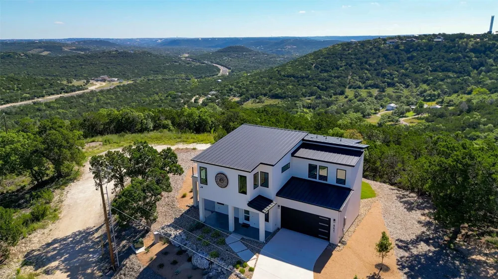 New Price! Bring all offers! Experience your dream retreat in this new custom-built, two-story home, with breathtaking Hill Country views and sunsets. Built in 2024 with attention to quality and detail this 3-bedroom + office, 2.5-bath home features a seamless flow for indoor-outdoor living. Downstairs features on open flex space, 2- guest rooms with an expansive adjoining patio, guest bathroom, and laundry room. Head upstairs to the office that could be used as a 4th bedroom, powder room and open-concept great room with high ceilings, creating an airy, expansive feel. The chef’s kitchen includes high-end Thermador appliances, custom cabinetry, and elegant Quartz countertops—a true culinary haven. The great room includes an electric fireplace and an expansive patio overlooking the hilltops, perfect for year-round indoor-outdoor enjoyment. The primary suite provides a luxurious retreat with a walk-out patio, 2nd laundry room and en-suite bath with a soaking tub and shower. Upgrades include a metal roof, 2 x 6 framing, spray foam insulation, professional landscaping, and expansive Anderson picture windows framing stunning views. Combining elegance and ease, this exceptional property offers luxury, energy efficiency, and the natural beauty of the Hill Country—ideal for a peaceful, sophisticated lifestyle. Currently situated on a low maintenance lot, but if more land and privacy is desired, the 4 adjacent lots are available.